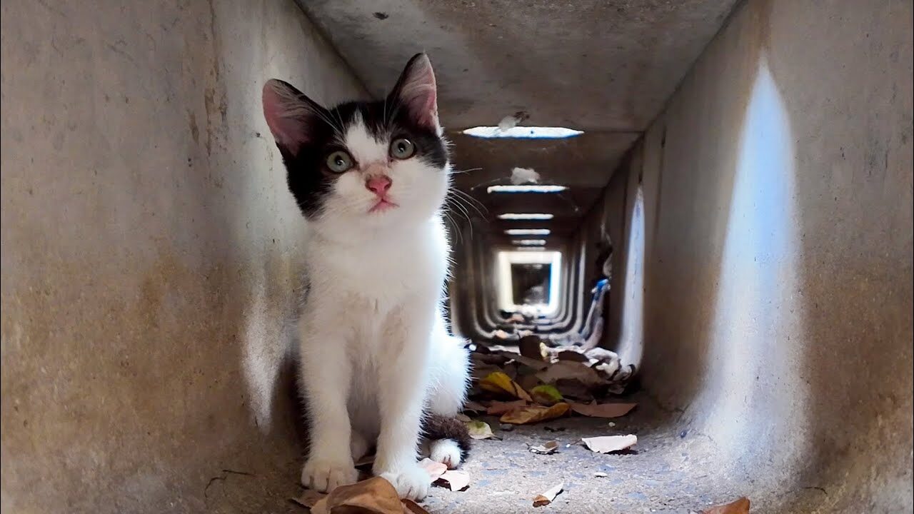 ふと側溝の中を覗くと、そこにはちょこんと座って小首を傾げる子猫がいました。周囲の人間の足音やクルマの排気音が気になるのか、キョロキョロとあたりを見回しています。